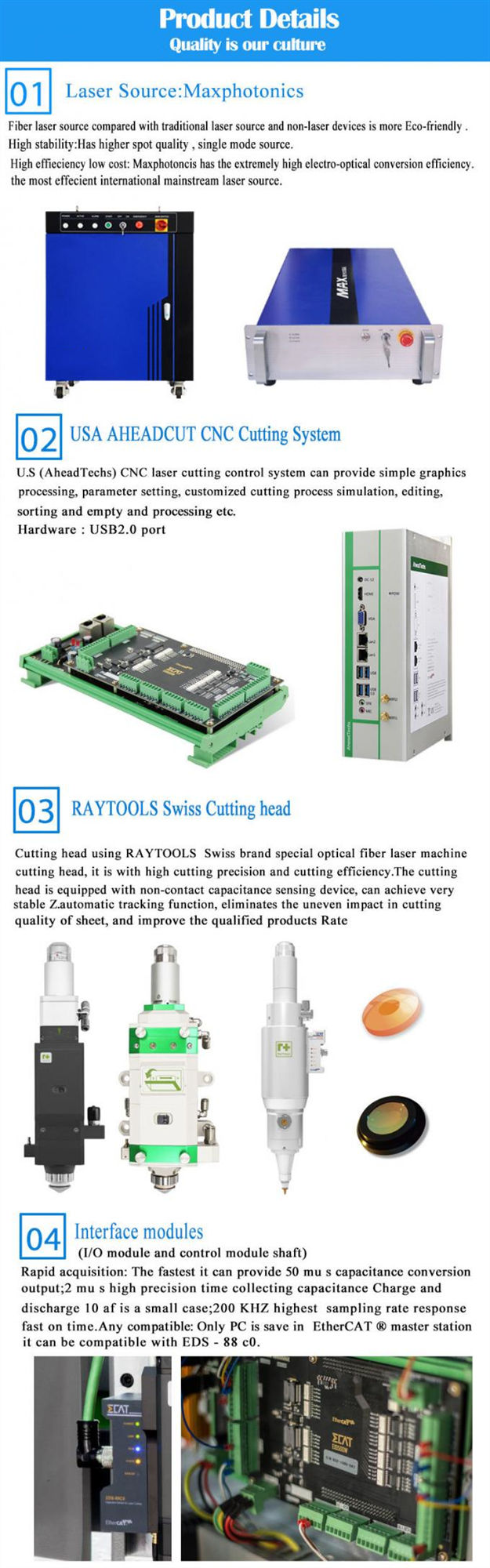 Maşın idxal olunan lif lazer, təbii qranit bazası, idxal olunan servo motor, yüksək dəqiqlikdə çarpaz platforma quruluşu ilə.